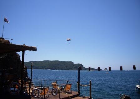 Por la tarde a Budva. A dos kilómetros del hotel Iberostar por un paseo que bordea la montaña y durante el que nos detenemos, cómo no podía ser de otra manera, en el chiringuito más apetecible. Con la música de fondo, sin prisa porque todo está detenido; cervecitas para nosotros y helados para las niñas. Como volver a la playa de cuándo éramos niños aunque sea el Adriático y no el Mediterráneo el espejito de azulete de la infancia.