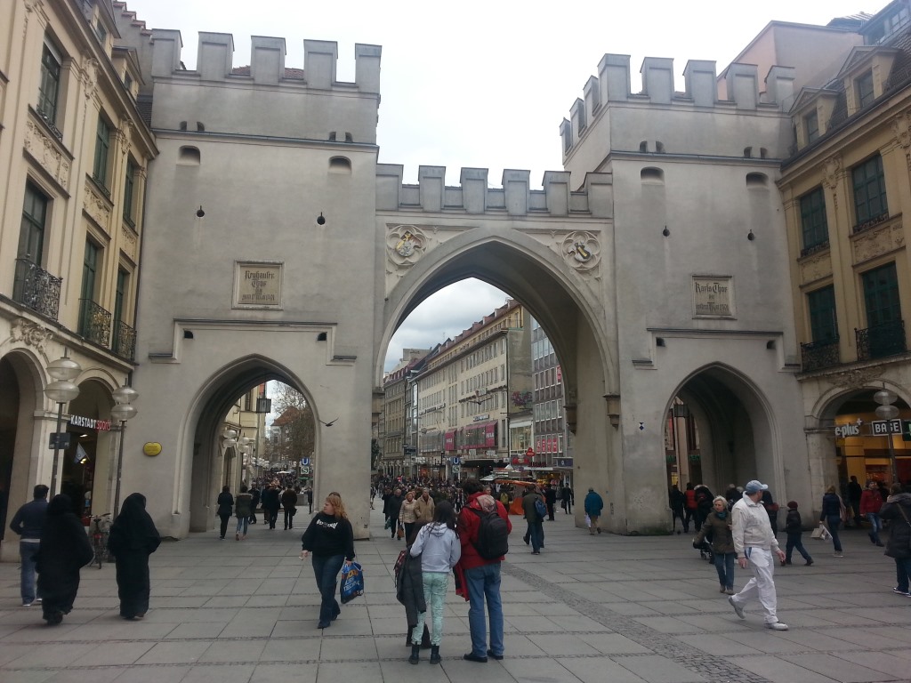 En cuestión de minutos ante nosotros el símbolo por antonomasia de la capital bávara: las dos torres coronadas por sendas cúpulas de la Catedral, la Frauenkirche, sirve de faro y guía. Tres son las puertas que permanecen de la vieja ciudad, y nosotros cruzamos por la Karlstor. Y allí empieza el bullicio. Tiendas por doquier, un ambiente de lo más alegre, iglesias, cervecerías, un totum revolutum fantástico. La peatonal Neuhasser desemboca en la famosa Mariantzplaz, una plaza de cuento con su ayuntamiento, carrillón, y el viejo ayuntamiento cerrando la plaza.